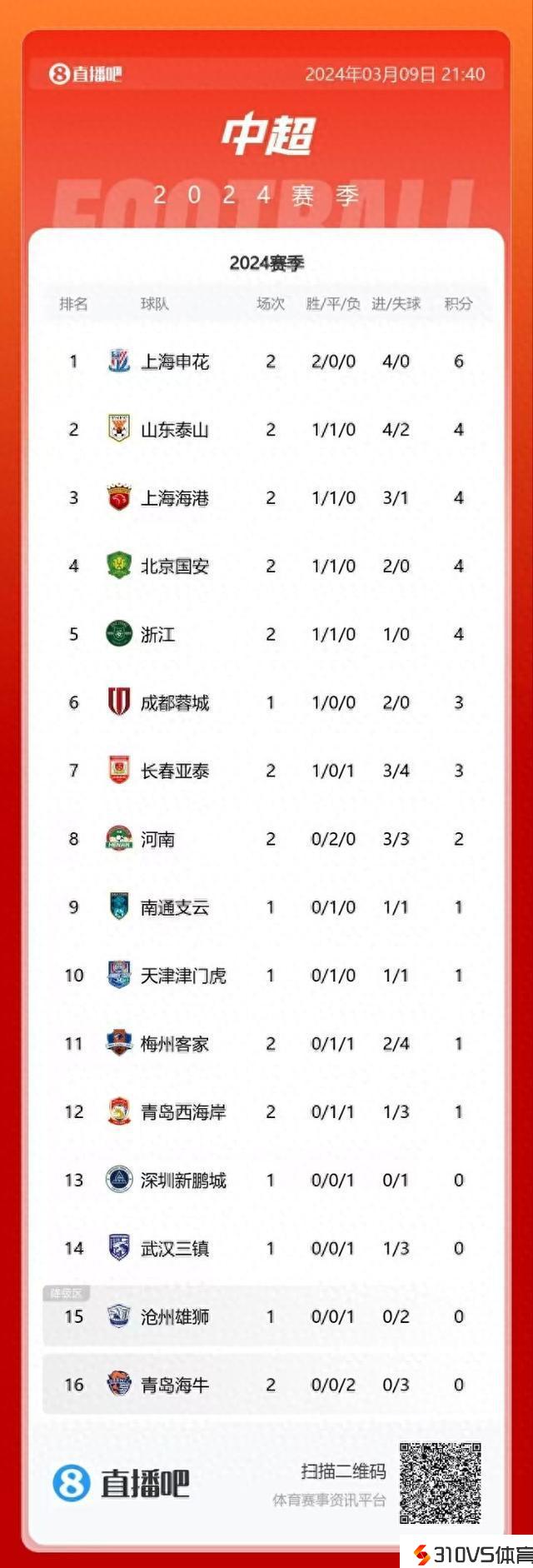 中超积分榜:山东海港国安浙江四队0-0 分列2/3/4/5名 申花暂第1