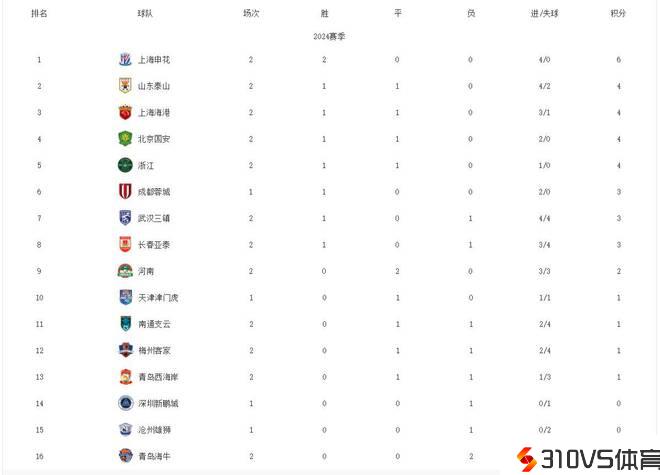 中超积分榜:泰山战平国安暂列第二 申花两连胜位居第1