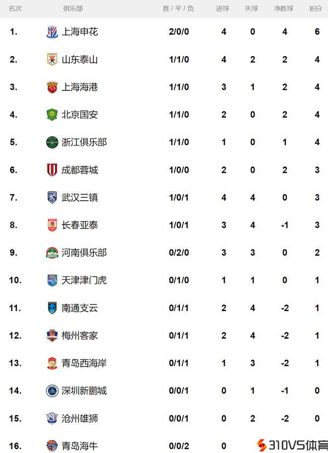 在此前一天停止的2场竞赛中,上海申花2-0完胜升班马青岛西海岸之后,成为首支2连胜的球队,登上榜首。青岛海牛主场0-1不敌长春亚泰,遭遇两连败,排名垫底。
