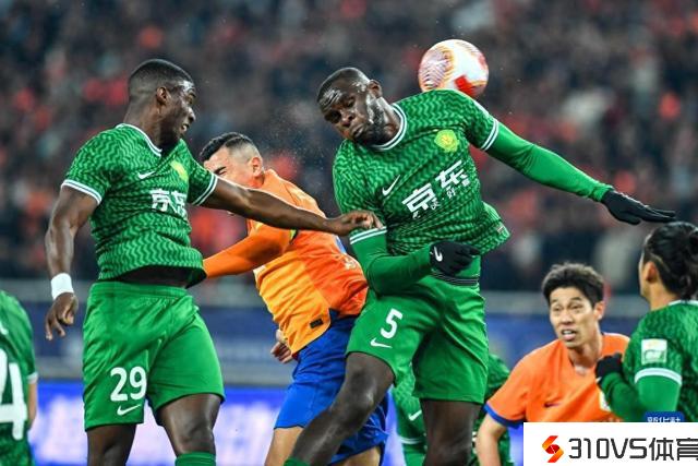 3月9日,北京国安队球员法比奥(左一)、恩加德乌(左三)与山东泰山队球员贾德松(左二)在竞赛中争顶。