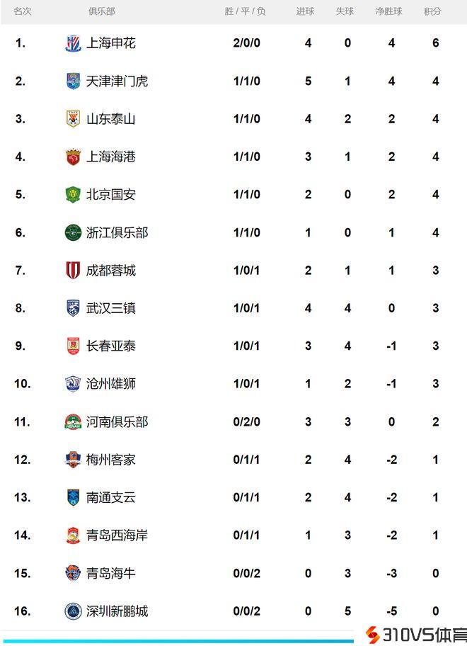 其中,上海申花本轮2-0完胜升班马青岛西海岸之后,成为唯逐一支两连胜的球队,而且2战取得4个进球,0失球,独自领跑积分榜。