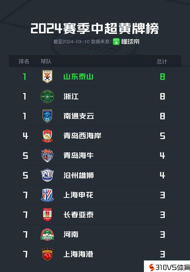 中超最新黄牌榜:山东、浙江、南通两轮8张黄牌并列第一