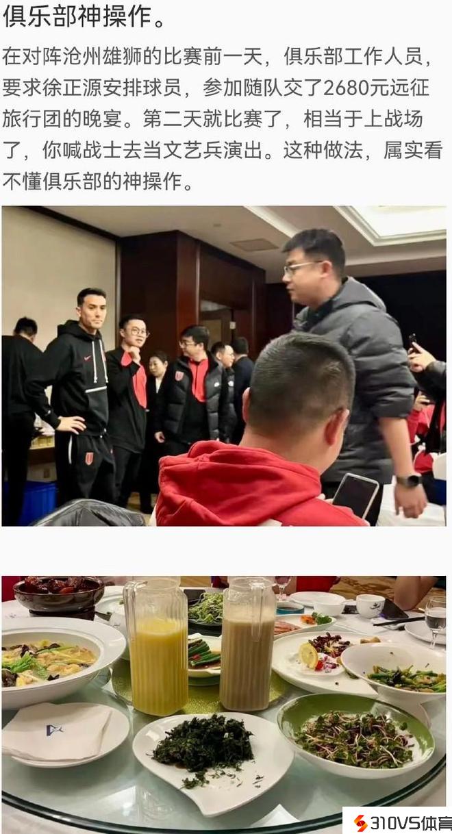 该截图称,在对阵沧州雄狮的竞赛前一天,俱乐部任务人员要求徐正源布置球员,参与随队交了2680元远征游览团的晚宴。第二天就竞赛了,相当于上战场了,你喊战士去当文艺兵演出。这种做法,失实看不懂俱乐部的神操作。