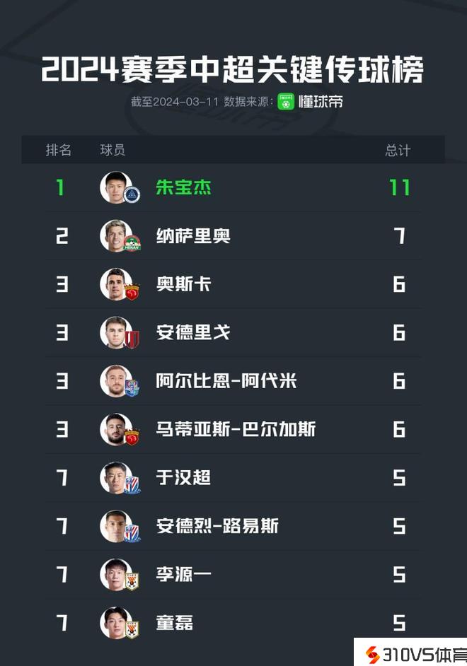 中超最新关键传球榜:朱宝杰11次居首,纳萨里奥7次列第二