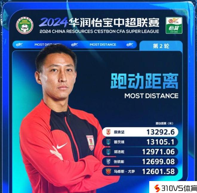 中超第2轮跑动榜:廖承坚居首,两名队员打破13000米大关
