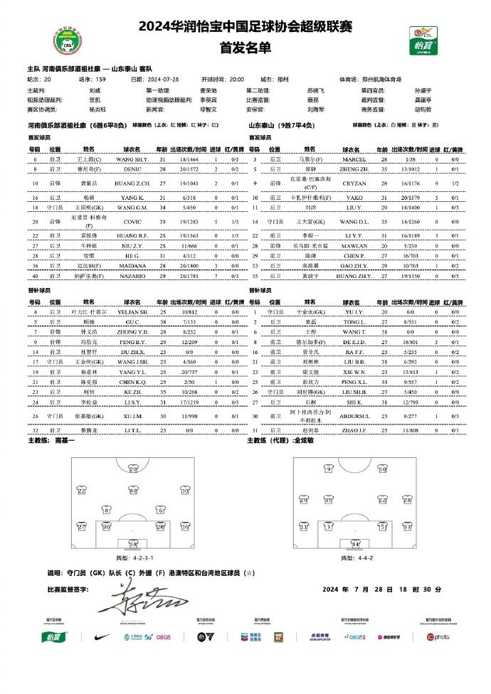 北京时间7月28日,中超联赛,河南队主场迎战山东泰山。赛前两队首发出炉: