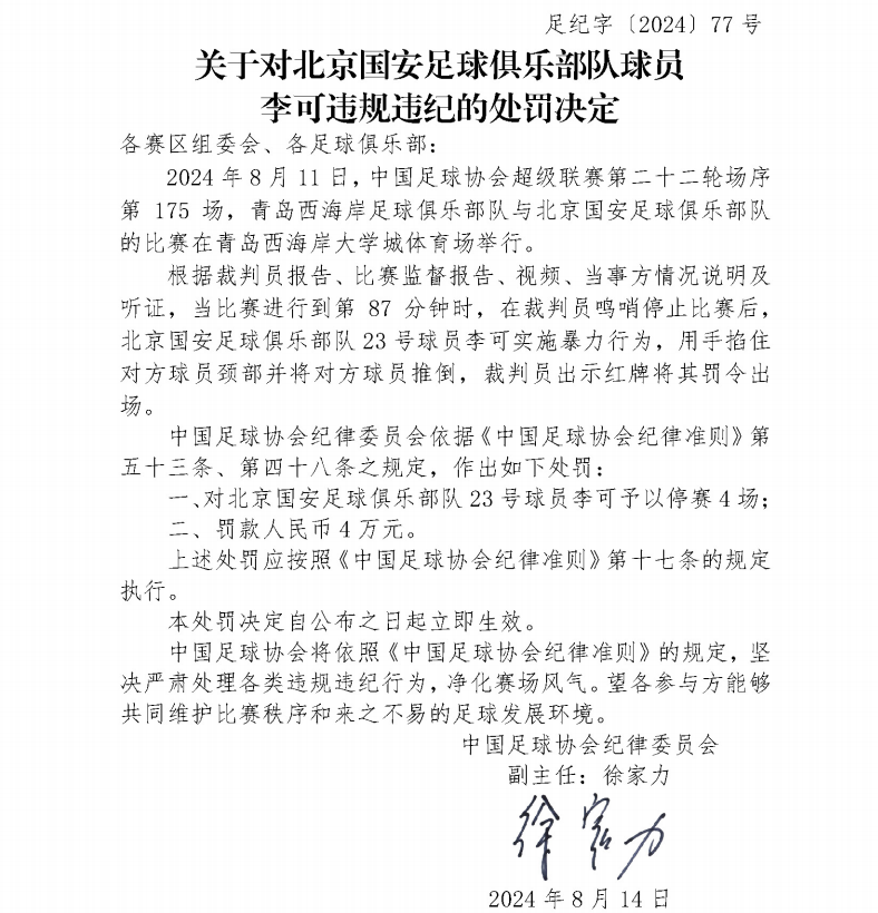 如今,中国足协纪律委员会根据《中国足球协会纪律准则》相关规定,对李可处以停赛4场、罚款4万元的处罚。