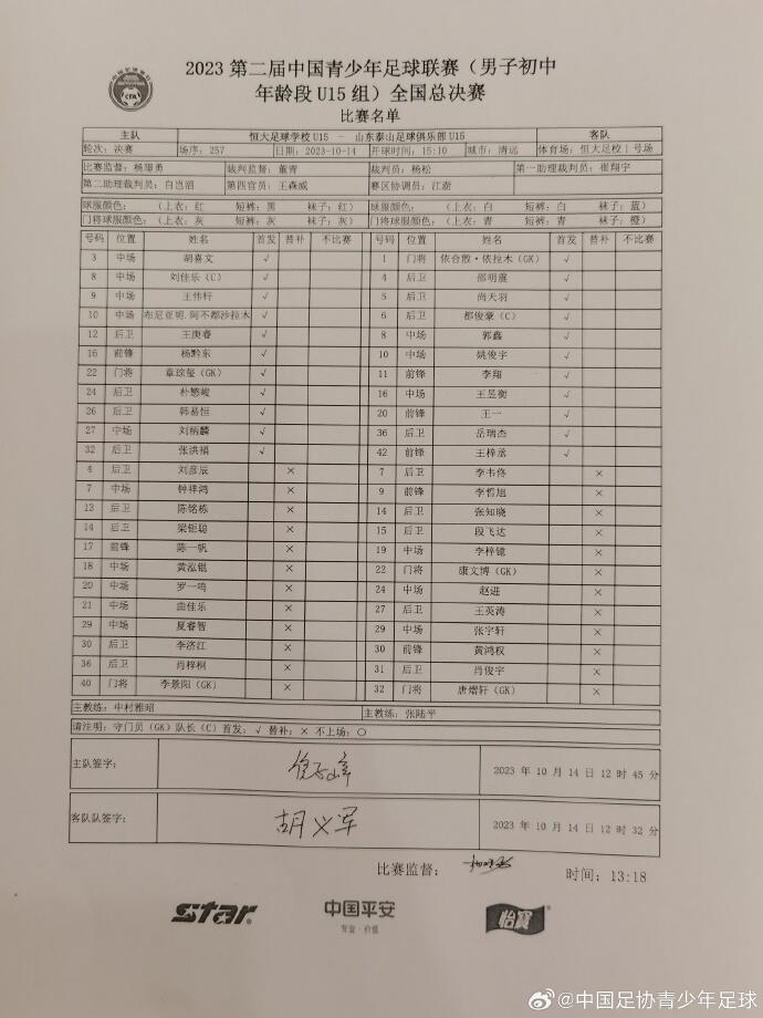 中青赛U15决赛首回合:恒大1-1泰山!尚天羽回头望月,王伟轩破门